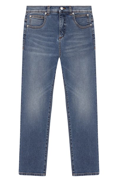 Синие джинсы прямого кроя изготовили из плотного хлопка. Чтобы изделие комфортно садилось по фигуре и не потеряло форму со временем, в состав ткани добавили прочные синтетические волокна. Неравномерный цвет модели подчеркнули словно стертой эмблемой бренда.