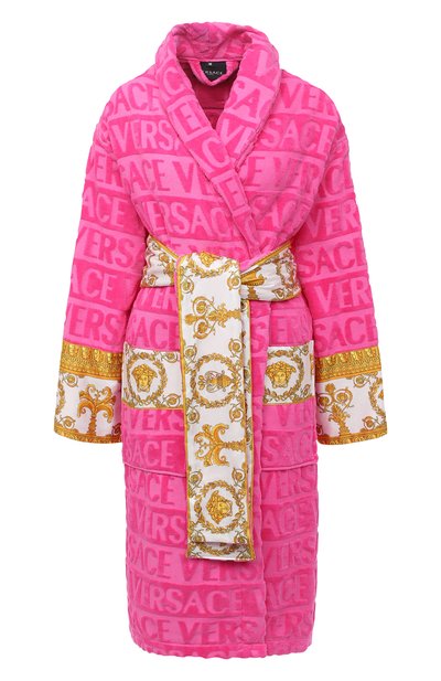 Халат с длинным двусторонним поясом не только создаст атмосферу уюта, но и поднимет настроение. Справиться с первой задачей помогает плотный махровый хлопок с рельефным брендированным узором, а со второй — ярко-розовый цвет. Модель украсили белыми шелковистыми вставками с орнаментом Baroque.