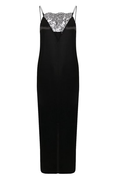 Черное платье-комбинация с тонкими бретелями и полупрозрачной кружевной вставкой, прикрывающей глубокий вырез, сшито из мягкого струящегося атласа на основе вискозы. Изделие вошло в коллекцию сезона весна-лето. Наши стилисты предлагают завершить образ золотистыми босоножками на шпильке и леопардовым клатчем.