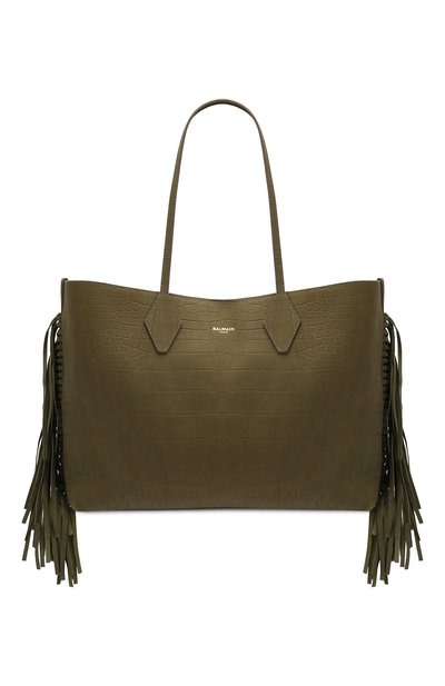 В весенне-летнюю коллекцию марки, основанной Пьером Бальманом, вошел шопер из плотной кожи, умело притворяющейся крокодиловой. Почти полной идентичности добились неоднородным цветом хаки и тисненым узором. По бокам узкие полоски материала сплели и сформировали из них ниспадающую бахрому. В сумке хватит места для кошелька, зонта и бумаг формата А4.