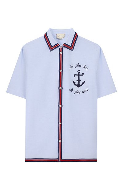 Голубая рубашка с отложным воротником и трехцветным кантом дополнена вышитыми изображением якоря и надписью «Le plus loin, Le plus serre», которой обычно украшали ювелирные изделия начала XIX века. Похожая модель из мягкого тонкого хлопка есть и во взрослой линии, поэтому она может стать основой образа в стиле family look.