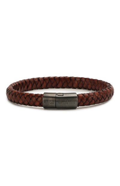 Для изготовления коричневого браслета мастера марки использовали мягкую прочную кожу. Изделие сплели из узких полос этого материала так, что рисунок напоминает чешуйки на змеиной шкуре. Аксессуар застегивается крупным замком из стерлингового серебра 925 пробы, покрытого слоем темного родия.