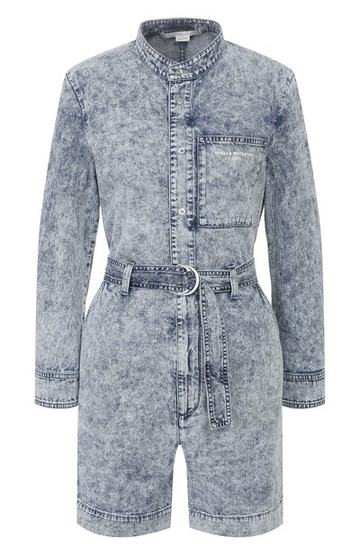 Укороченный синий комбинезон из весенне-летней коллекции станет основой повседневного образа с кедами на широкой подошве, а задать наряду более расслабленное настроение помогут закатанные рукава. Для создания модели с воротником-стойкой и накладным нагрудным карманом использовали мягкий прочный хлопок с эффектом делаве. Стелла Маккартни дополнила изделие поясом, подчеркивающим талию.
