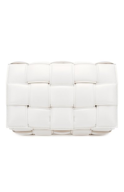 Дэниел Ли вновь экспериментировал со старинным плетением intrecciato, и сумка Padded Cassette из весенне-летней коллекции — прямое тому подтверждение. Мастера выполнили аксессуар из тонкой нежной наппы, которая сшита в широкие двусторонние полосы с промежуточным мягким слоем. Такой материал придает белоснежному изделию с откидным клапаном объем и фактуру.