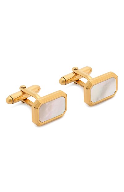 Небольшие запонки-восьмиугольники из матового металла цвета античного золота помогут правильно расставить акценты в лаконичном образе. Изделия с Т-образными застежками дополнены тонкими переливающимися пластинами из речного перламутра.