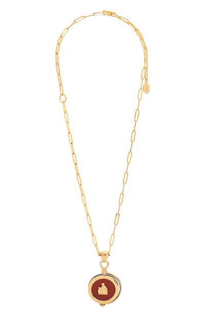 По декору круглого кулона легко узнать его принадлежность марке: модель со вставкой из агата украсили эмблемой Mother and child, придуманной Полем Ирибом в 1922 году. Для изготовления аксессуара с цепочкой, собранной из крупных звеньев, мастера бренда использовали легкую золотистую латунь.