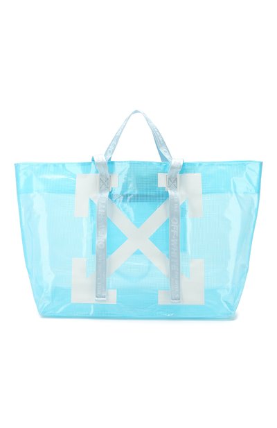 Аксессуары марки легко узнать по мотиву в виде перекрещенных стрел, на создание которого Верджила Абло вдохновила дорожная разметка. Не стала исключением и большая полупрозрачная сумка цвета морской волны. Для изготовления модели из весенне-летней коллекции использовали прочный полимерный материал. Две пары ручек разной длины выполнили из текстильных лент со знаковым жаккардовым узором Industrial.