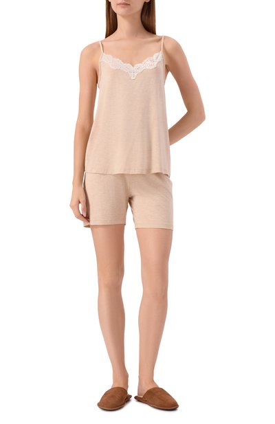Пижаму Sandalo выполнили из модала с добавлением лайкры. Топ с кружевом Leavers по линии декольте дополнили шортами с эластичным поясом.