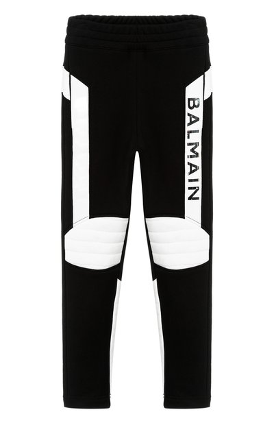 Прямые черные брюки дополнены белыми стегаными вставками на коленях, как у байкерских моделей, и будто позаимствованным у джоггеров эластичным поясом. Графичное монохромное изделие с логотипом марки сшито из мягкого хлопкового трикотажа, который не сковывает движения и позволяет телу дышать.