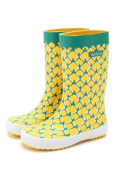Желтые сапоги с ананасовым мотивом выполнили из легкого гибкого каучука. Прочный материал не пропускает воду и просто очищается от загрязнений, мягкая хлопковая подкладка сохраняет тепло и отводит лишнюю влагу, а рифленая резиновая подошва обеспечивает хорошее сцепление, поэтому обувь отлично подходит для дождливой погоды. Модель декорировали патчем с логотипом бренда.