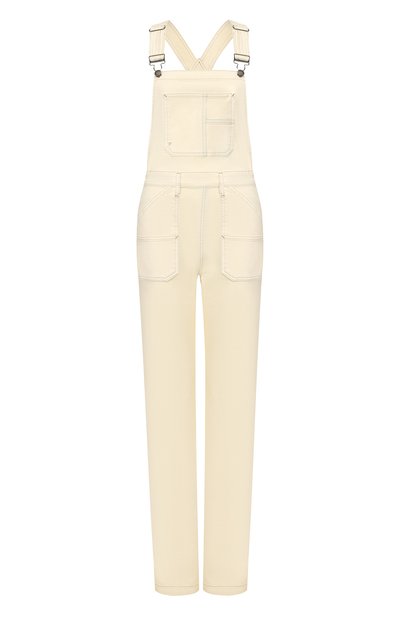 У комбинезона из весенне-летней коллекции математически выверенный силуэт. Классический прямой крой дизайнеры поддержали вставкой на линии талии и крупными накладными карманами. Модель с регулируемыми по длине лямками сшили из фактурного хлопка нейтрального кремового оттенка. Чтобы изделие из плотного материала не стесняло движения, в состав включили эластан.