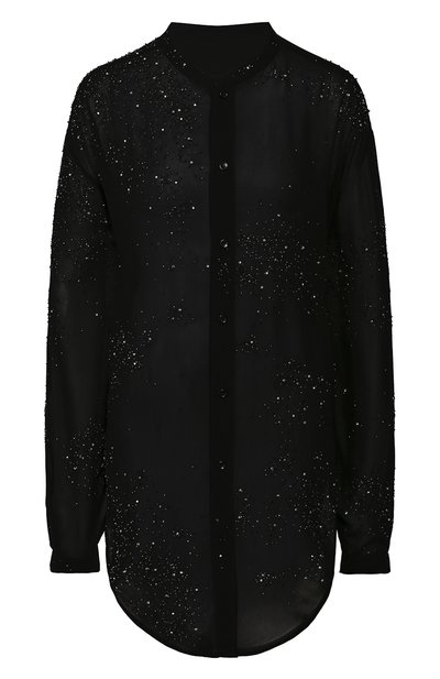 Ив Сен-Лоран называл черный цвет универсальным. Энтони Ваккарелло использовал его, чтобы придать этой рубашке магию ночного неба: модель из полупрозрачного шифона расшили миниатюрным мерцающим бисером и сверкающими кристаллами. В сочетании с брюками такая вещь впишется в коктейльный наряд, а в комплекте с джинсами – и в повседневный образ: достаточно завязать ее узлом на поясе.