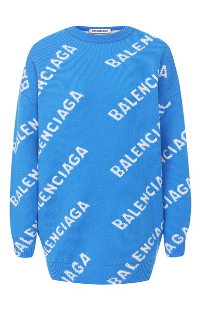 Яркий небесно-голубой оттенок свободного пуловера из весенне-летней коллекции Демна Гвасалия сделал фоном для графичного паттерна: фамилию Кристобаля Баленсиаги выполнили белыми нитями в технике интарсии. Модель со спущенной линией плеч связали из мягкой легкой шерсти. Чтобы изделие из такого материала лучше сохранило внешний вид, в состав пряжи добавили волокна прочного полиэстера.