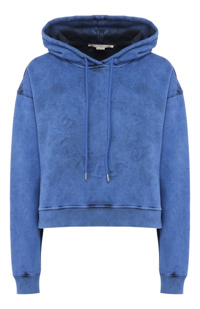 Трепетное отношение Стеллы Маккартни к природе можно заметить и в синем укороченном худи из весенне-летней коллекции. Для изготовления модели с мраморным эффектом и рельефным брендированным узором дизайнер выбрала органический хлопок. На его выращивание и сбор уходит на 70% меньше воды. Объемный капюшон у изделия можно регулировать.