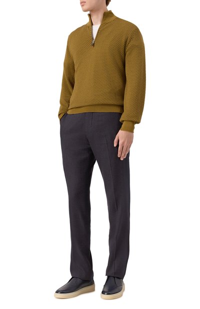 Джемпер с воротником-стойкой, манжетами и поясом в рубчик выполнен из гладкого хлопкового трикотажа. Модель, застегивающаяся короткой молнией, легко впишется в базовый гардероб.