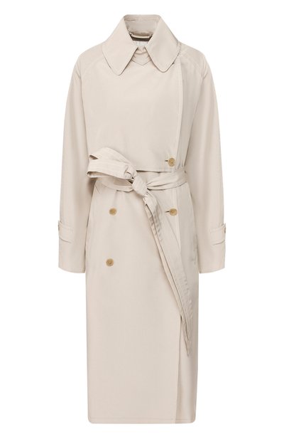 В случае с бежевым тренчем дизайнер бренда сделал силуэт более свободным по сравнению с традиционными моделями и изменил подход к материалу. Для пошива изделия из весенне-летней коллекции вместо плотного габардина использовали шелковистую ткань на основе нейлона. Она защищает от ветра, но при этом пропускает воздух за счет добавления хлопка. В комплекте — длинный пояс в тон.