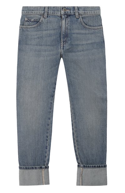 Прямые синие джинсы с искусственными потертостями и легкими светлыми заломами сшиты мастерами марки из прочного легкого хлопка. Такой материал сохраняет форму даже после многократных стирок и не растягивается со временем, поэтому изделие из него прослужит долго. Карман сзади украшен вышивкой в виде надписи «Gucci Band».