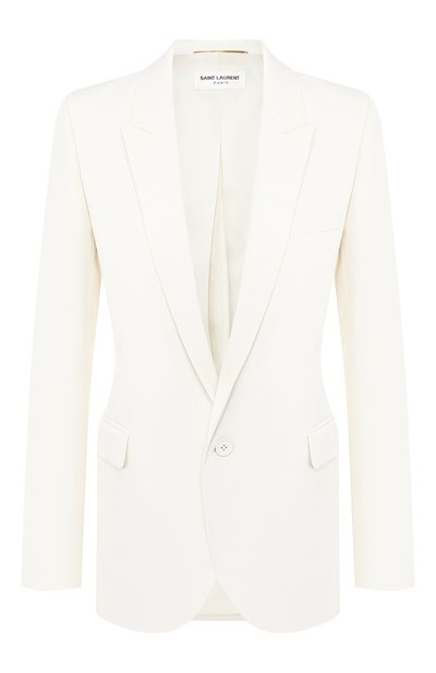 С жакетом из весенне-летней коллекции Энтони Ваккарелло обошелся бережно: чистый белый цвет, четкий силуэт и полное отсутствие декора. Для создания модели мастера марки, основанной Ивом Сен-Лораном, использовали плотную мягкую шерсть. Материал почти не мнется, поэтому чтобы освежить изделие, достаточно слегка увлажнить ткань.