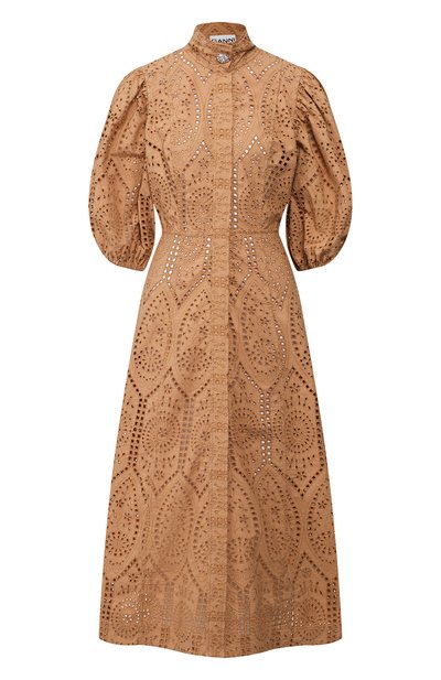 В сезоне весна-лето приталенное платье-рубашка выглядит романт ичнее. Правильное настроение дизайнеры марки задали при помощи объемных рукавов 3/4, высокого воротника-стойки с крупной сверкающей брошью и ажурного материала. Для создания бежевой модели они выбрали тонкое хлопковое кружево broderie anglaise с цветочным орнаментом.