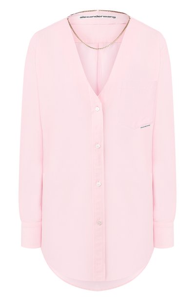 Розовая рубашка из весенне-летней коллекции поддержит расслабленный наряд. За правильное настроение отвечают свободный крой и спущенная линия плеч. Глубокий V-образный вырез, подчеркнутый цепочкой, придает вещи долю п ровокации. Для пошива модели Александр Вэнг выбрал мягкий дышащий лиоцелл с добавлением прочных эластичных волокон.