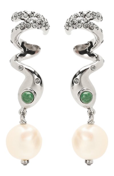 Миниатюрные пусеты в виде змей гармонично дополнят и повседневный образ, и коктейльный наряд. Для создания модели мастера марки использовали прочный золотистый сплав из латуни. Аксессуар дополнили жемчугом и сверкающими полупрозрачными кристаллами.