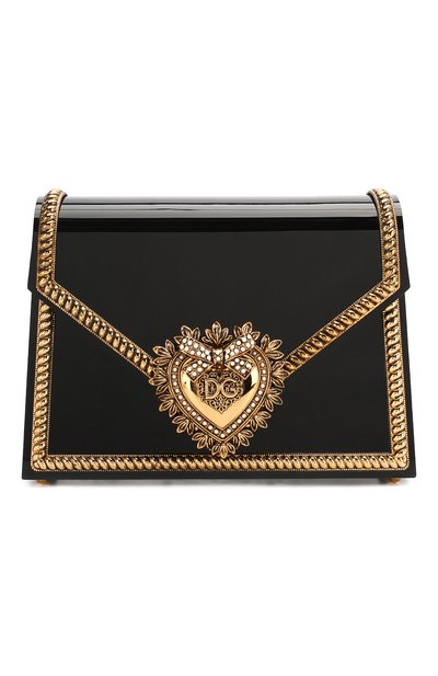 В сезоне весна-лето Доменико Дольче и Стефано Габбана вывели знаковую сумку Devotion на новый уровень за счет материала. Для изготовления небол ьшой черной модели с подкладкой из мягкой наппы дизайнеры выбрали гладкий глянцевый плексиглас. Фигурный клапан традиционно украсили ювелирной пряжкой в виде сердца, инкрустированной миниатюрными жемчужинами, а края подчеркнули рельефным орнаментом цвета старинного золота.