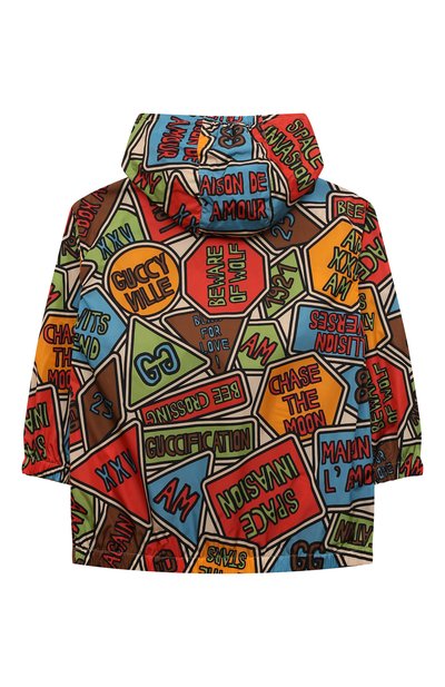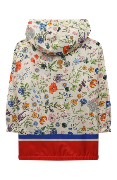 Мастера марки сшили ветровку с глубоким капюшоном из тонкого шелковистого нейлона, устойчивого к капризам погоды. Модель с цветочным принтом (интерпретация знакового мотива Flora) декорировали широким кантом в цветах ленты Sylvie Web. Изделие с эластичными манжетами застегивается молнией.