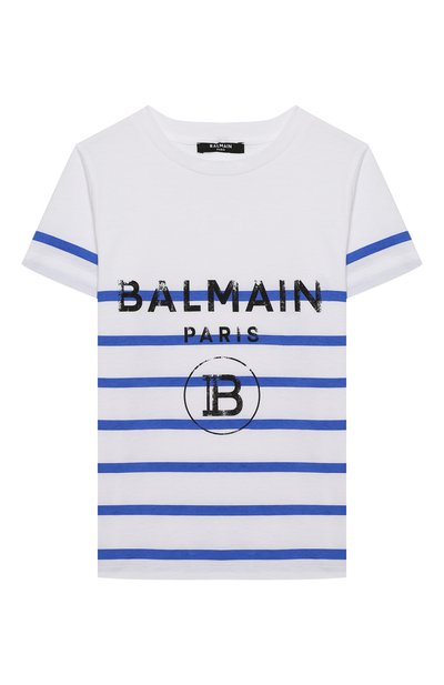 Мастера марки использовали для пошива белой футболки мягкое полотно, связанное из дышащей хлопковой пряжи. Такой материал поддерживает оптимальную для тела температуру и хорошо тянется, поэтому в изделии будет комфортно во время активных игр. Модель с голубым полосатым мотивом декорировали логотипом и эмблемой бренда. Надписи выглядят так, словно слегка стерлись после частых стирок.