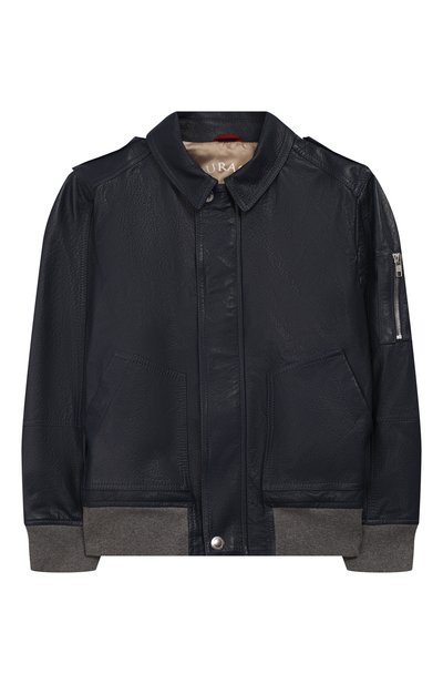 Темно-синяя куртка внешне похожа на бомбер, а материал для ее изготовления будто позаимствовали у косухи. Модель сшили из матовой кожи наппа, которую специально минимально обработали: так сохранили естественные крупнозернистую фактуру и эластичность. Манжеты и пояс выполнили из серого мягкого трикотажа. Чтобы вещь не сковывала даже во время активных игр и в ней было комфортно, и зделие дополнили подкладкой из нежной купры.