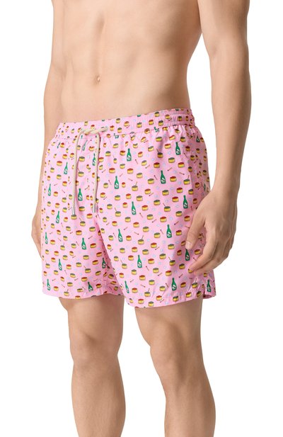 В ярком принте на белых плавках-шортах прямого кроя многократно повторяется изображение Халка. С гаммой рисунка перекликается зеленый шнур в эластичном поясе-кулиске с брендированным патчем. Модель с тремя карманами сшита из тонкого переработанного полиэстера, под которым скрыт легкий сетчатый подклад.