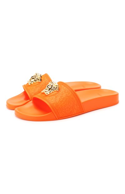 Шлепанцы Barocco из весенне-летней коллекции марки, основанной Джанни Версаче, обязаны своим названием тисненому барочному узору на широкой союзке из гладкого полимера. Рельефный меандровый мотив и объемная голова горгоны Медузы поддерживают фирменный декор, а насыщенный апельсиновый оттенок бодрит не хуже, чем цитрусовый фрэш.