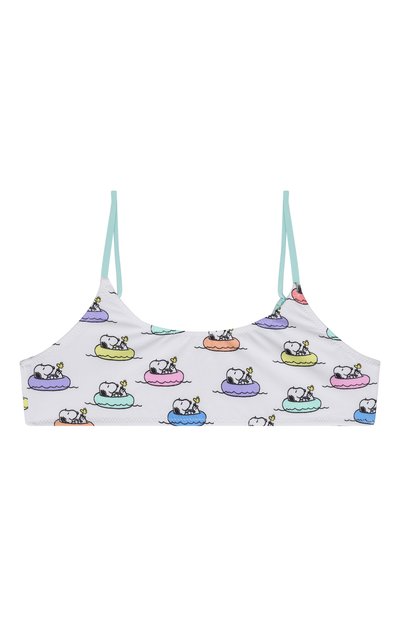 Раздельный купальник выполнили из быстросохнущей микрофибры и украсили принтом в виде уток. Лиф регулируется слайдерами на бретелях, а плавки — завязками по бокам.
