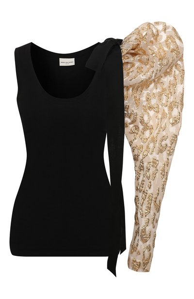 Черный топ скомбинировали из мягкого хлопкового трикотажа и тонкой парчи с рельефным узором. На показе весенне-летней коллекции Дрис Ван Нотен сочетал модель с красной юбкой и золотистыми туфлями. Наши стилисты предлагают повторить образ, но отдать предпочтение босоножкам на шпильке.