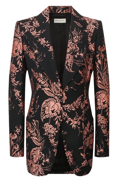 Черный пиджак из весенне-летней коллекции Дрис ван Нотен создал в своих лучших традициях. У модели отчетливый силуэт с ярко выраженной линией плеч и заостренными лацканами соседствует со сложносочиненным цветочным узором персикового оттенка. На показе изделие из плотного жаккарда с шелковистым блеском сочетали с зебровой блузой, черными брюками и золотистыми ботильонами.