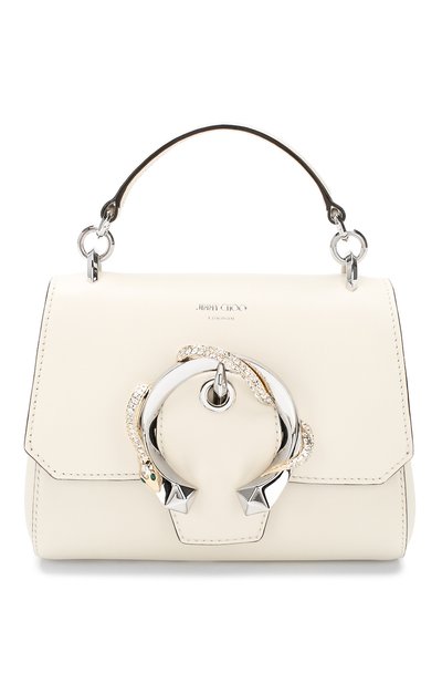Ключевой деталью белой сумки Madeline племянница Джимми Чу Сандра Чой сделала С-образную серебристую пряжку, обвитую позолоченной змеей. На ней эффектно играют лучами освещения зеленые и прозрачные кристаллы. Модель из гладкой матовой кожи вошла в коллекцию сезона весна-лето. Для удобства аксессуар, в котором поместятся ключи, картхолдер и смартфон, дополнили съемным плечевым ремнем.