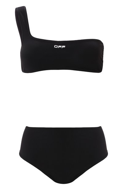 Для создания раздельного купальника лаконичного черного цвета Верджил Абло выбрал мягкую, но прочную лайкру, которая не выцветает от соленой воды, хлора и солнечных лучей. Асимметричное бра с бретелью на одно плечо декорировано небольшой белой надписью.
