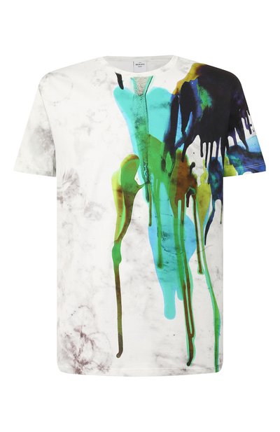 К созданию футболки из весенне-летней коллекции дизайнер бренда, основанного Алессандро Берлути, подошел весьма творчески. Сначала на белом хлопковом полотне сформировали абстрактный монохромный рисунок, а затем на уже на готовом изделии — цветной. Он выглядит так, словно на модель разлили разную краску. Чтобы не смещать фокус со спецэффекта, вещь лучше носить с лаконичной одеждой.