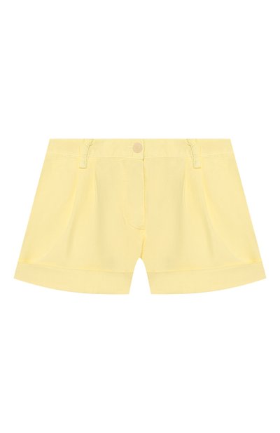 Для пошива бледно-желтых шортов с защипами использовали гипоаллергенный хлопковый габардин. Плотный материал способен пропускать воздух, но в чистом виде совсем не тянется. Чтобы изделие комфортно садилось по фигуре, в состав ткани включили стрейчевые нити, а на поясе сзади предусмотрели эластичную вставку. Брючины дополнили широкими отворотами.