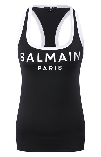 Нюансы силуэта черной майки подчеркнули широким белым кантом, который обрамляет и зону декольте, и перемычку в центре спины. В тон ему выполнили крупный принт в виде логотипа бренда, основанного Пьером Бальманом. Для пошива изделия из весенне-летней коллекции мастера марки использовали плотную эластичную ткань.