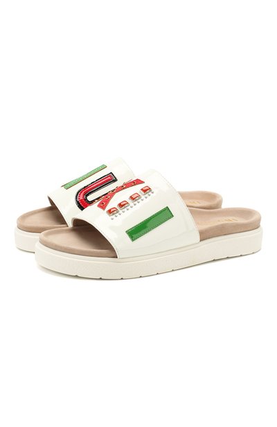 Крупное разделенное название марки на широких союзках превратило эти белые шлепанцы в гимн логомании. Красочные буквы выполнены вручную в разной технике, поэтому обувь из глянцевого материала получилась особенно яркой. Модель на анатомической подошве вошла в совместную с брендом Dipama капсульную коллекцию.