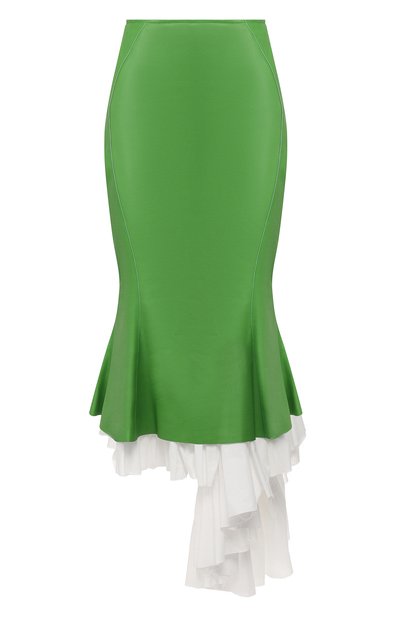 Секрет этой юбки заключается в сочетании разных цветов и фактур: для пошива изделия использовали гладкую изумрудную кожу и легкий белоснежный хлопковый поплин. На показе весенне-летней коллекции модель носили с сандалиями и блузой в тон, а наши стилисты предлагают дополнить образ розовым топом и черными мюлями.