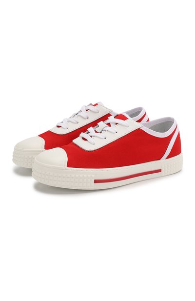 Для пошива кед мастера марки использовали ярко-красный гладкий текстиль, который оттеняют вставки из матовой кожи молочного оттенка и узкий белоснежный кант. Гибкая резиновая подошва с рельефным узором снижает нагрузку на суставы при ходьбе. Таким же материалом укрепили круглый мыс изделия.