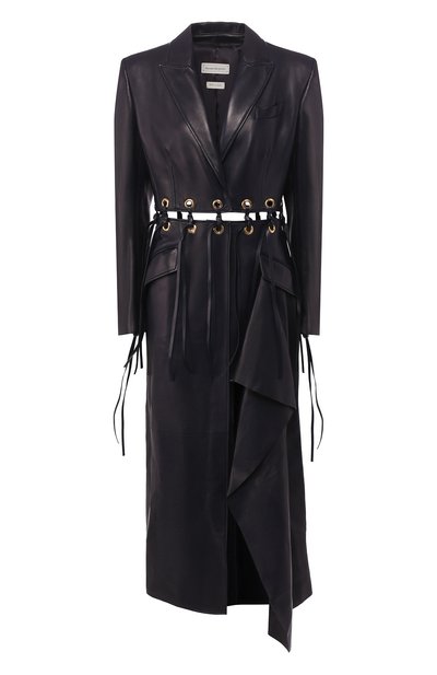Пальто в кожаном исполнении уже будет выглядеть небанально, но Сара Бертон нашла еще один способ, как вывести модель на новый уровень. Дизайнер украсила линию талии горизонтальным разрезом и люверсами, в которые продеты шнурки. Еще один спецэффект — асимметричный подол с драпировкой. Темно-синее изделие вошло в весенне-летнюю коллекцию марки, основанной Александром Маккуином.