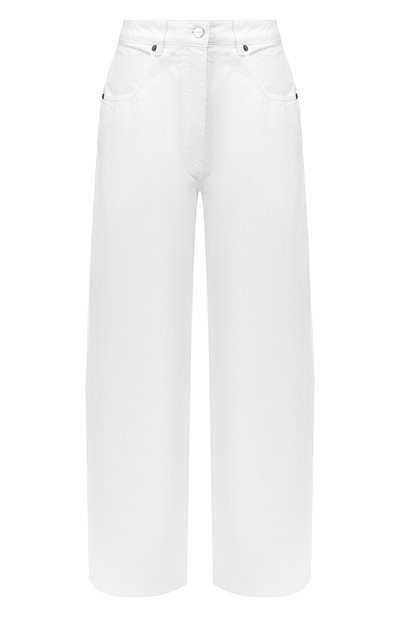 Белоснежные однотонные джинсы хорошо играют на контрасте, оттеняя пестрый декор, или наоборот, помогают формировать спокойные комплекты. Например, наши стилисты составили образ в пастельной гамме: подобрали к вещи голубую рубашку, бежевый плащ и серые кроссовки. Для пошива модели прямого кроя Симон Порт Жакмюс выбрал плотную хлопковую саржу. Изделие с высокой посадкой вошло в коллекцию сезона весна-лето.
