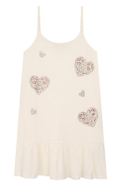 В кремовом сарафане будет комфортно в жаркую погоду. Его сшили из эластичного хлопкового джерси, которое хорошо пропускает воздух, впитывает влагу и не вызывает аллергию. На его фоне мерцают стразы, выложенные в узор в виде звезд. Широкую вставку на подоле задрапировали по линии отреза, поэтому получили мягкие волны. Плетеные трикотажные бретельки не впиваются в кожу.