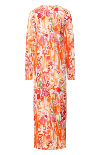 В коллекции сезона весна-лето дизайнер предложил быть ближе к природе и выбрал вспомогательным компонентом яркие цветочные принты, эскизы для которых он придумывал сам. Например, на этом белом платье растения будто выполнили оранжевыми и красными акварельными красками. Модель с круглым вырезом сшили из мягкой шелковистой вискозы.