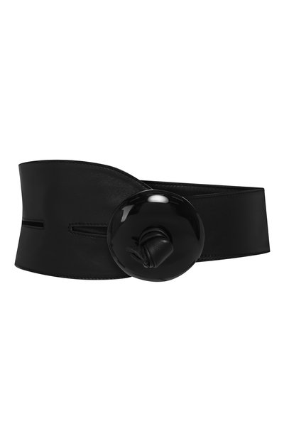 Яркий ремень — легкий и верный способ расставить акценты в образе. С этой ролью может справиться и абсолютно черный аксессуар, если его цвет компенсирует крой, как у широкой асимметричной модели с круглой глянцевой пряжкой. Изделие выполнили из матовой мелкозернистой кожи.