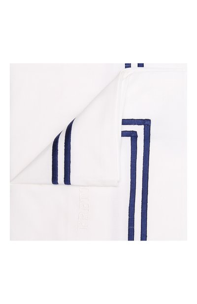 Белая наволочка украшена в ышитым полосатым узором кобальтового оттенка. Для изготовления модели мастера марки использовали легкий сатин с шелковистым сиянием. Таким его делают тщательно отобранные гладкие волокна премиального хлопка и фирменная технология отбеливания.