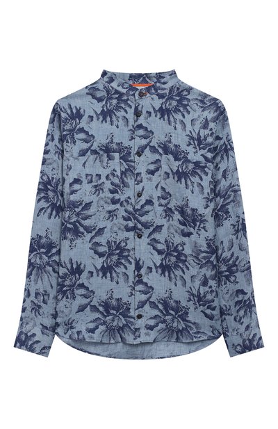 Синяя рубашка с монохромным цветочным принтом – идеальный вариант для жаркой погоды. За комфорт отвечает тонкий дышащий лен, который способен охлаждать поверхность кожи на несколько градусов. Модель с воротником-стойкой и асимметричным низом дополнили двумя накладными нагрудными карманами.