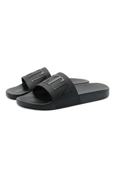 Черные резиновые шлепанцы с анатомической подошвой и нескользящей стелькой правильно распределяют нагрузку на суставы, поэтому в них будет комфортно и на пляже, и на прогулке. Обувь с широким ремешком украшена крупными тиснеными логотипами марки, основанной Валентино Гаравани.
